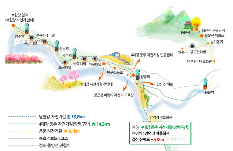 양평은 '자전거 레저 특구'라고 할 만큼 자전거 길이 달 닦여 있고 또 그만큼 자전거 애호가들이 자주 찾는 곳이에요.