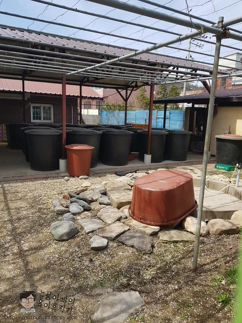 입구로 가는 길에 왼쪽 사진처럼 큰 대야? 가 무리 지어 있습니다.