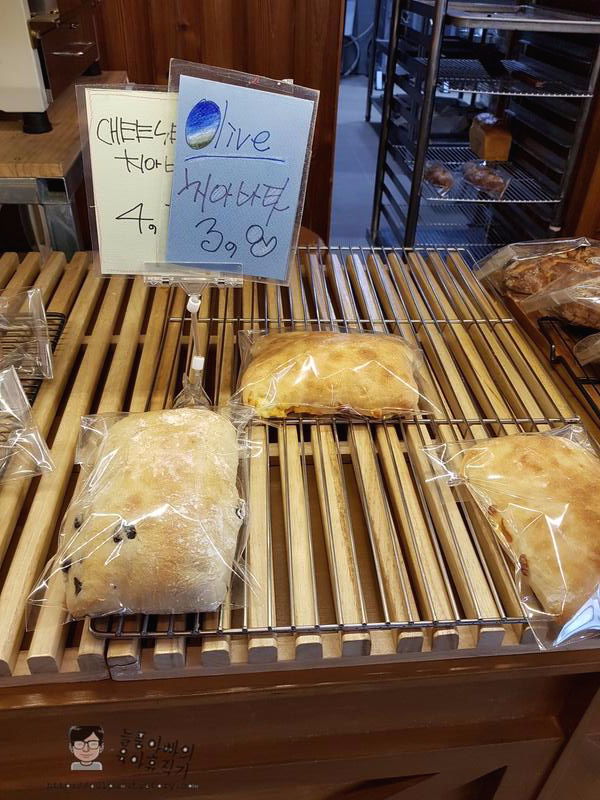 다양한 빵들이 있었는데 가량비?(가성비, 가심비처럼..ㅋ)라고 해야 하나 가격 대비 양이 많은 것처럼 보이는 '올리브 치아바타'빵과 아메리카노를 주문하고 앉았어요.