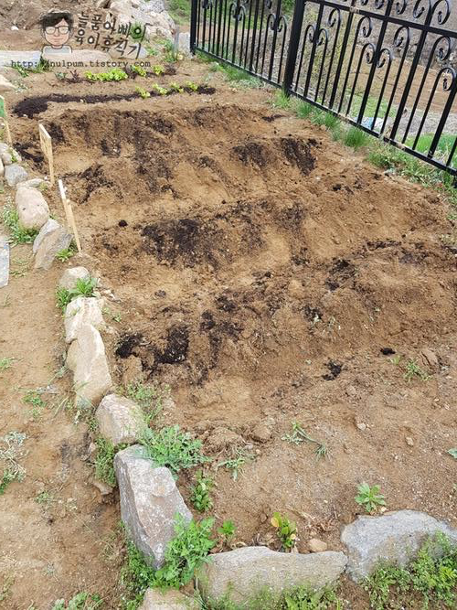덩그러니 팻말만 꽂혀있는 밭에 두둑을 만들고(두둑이란 말을 이번에 처음 알았어요) 비료를 뿌리고