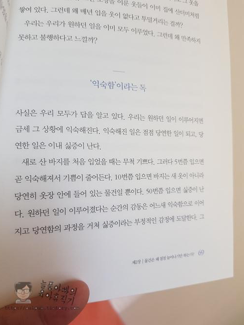 그러니 물건을 사도 기쁨은 잠시 금세 익숙해지거나 무감각해지고 또 다른 새로운 물건을 찾아