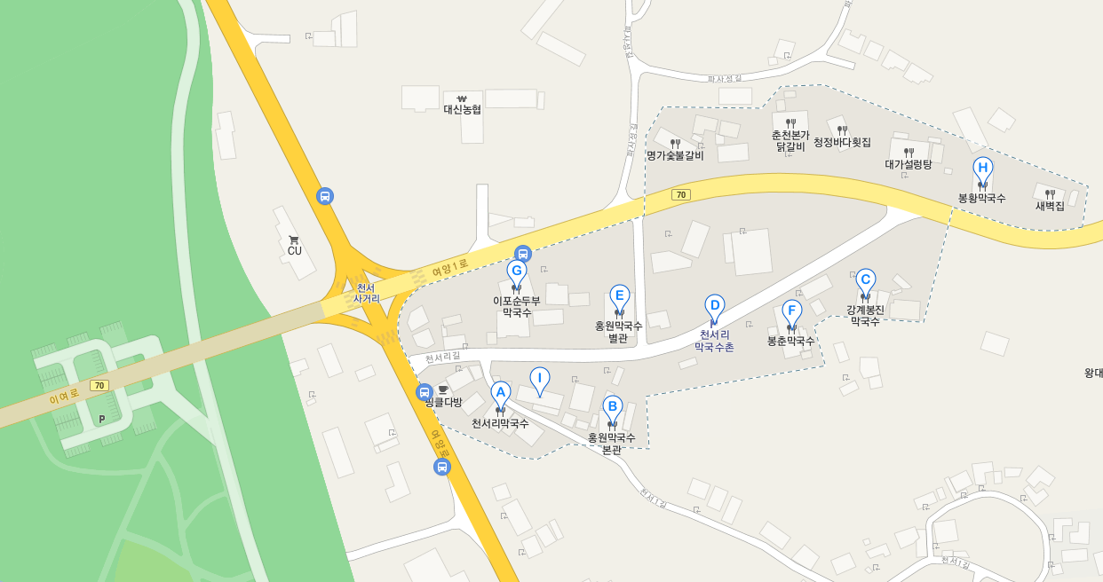 양평 개군면에서 남쪽으로 여주 이포대교 동쪽편으로 천서리 막국수촌이 있습니다.