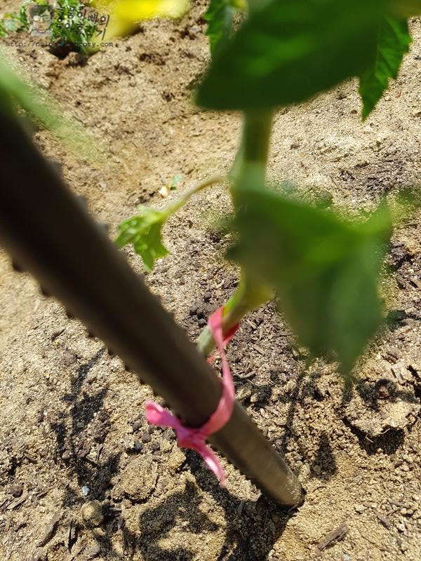 토마토, 고추 모종 옆에 지주대를 박고 끈으로 묶어 주었어요.
