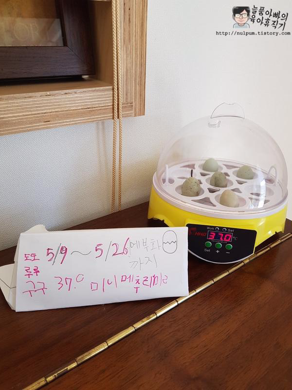 지금 피아노 위에는 부화 대기 중인 메추리알 5개도 있답니다.