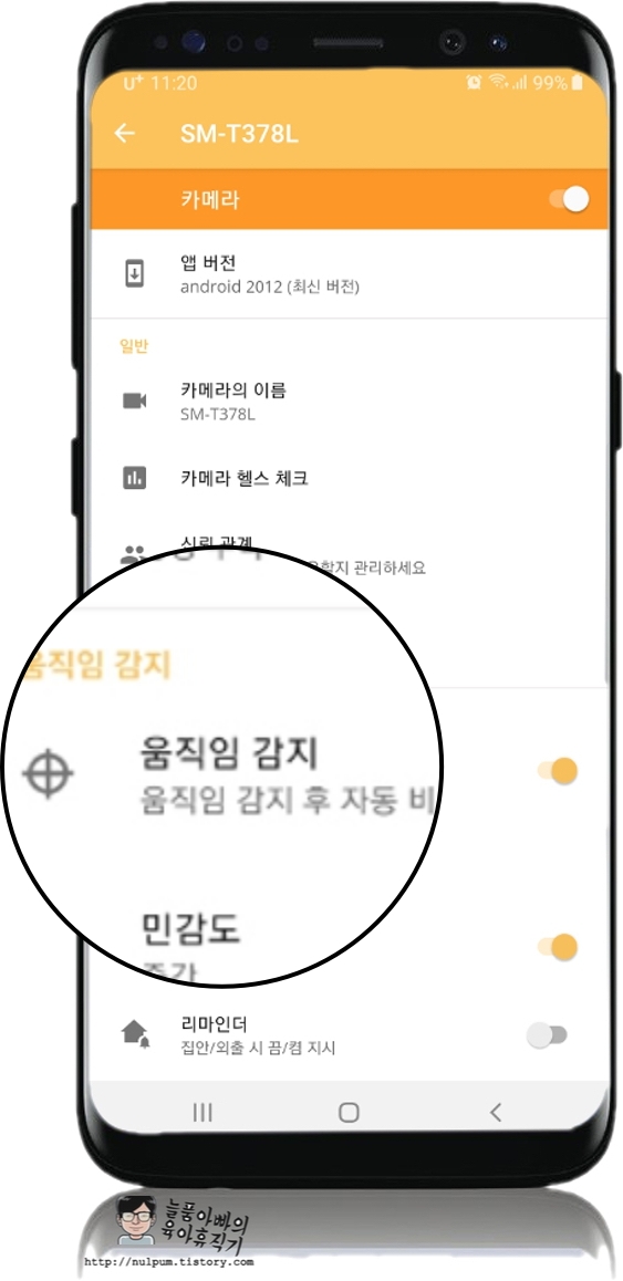 그리고 설정에서 움직임 감지 항목을 설정하면 자동으로 움직임을 감지하여 동영상을 저장해주기 때문에