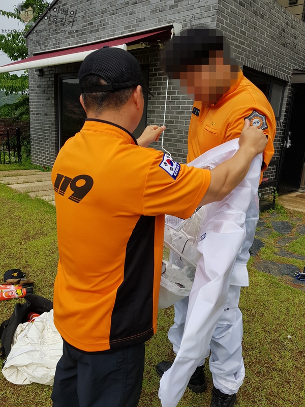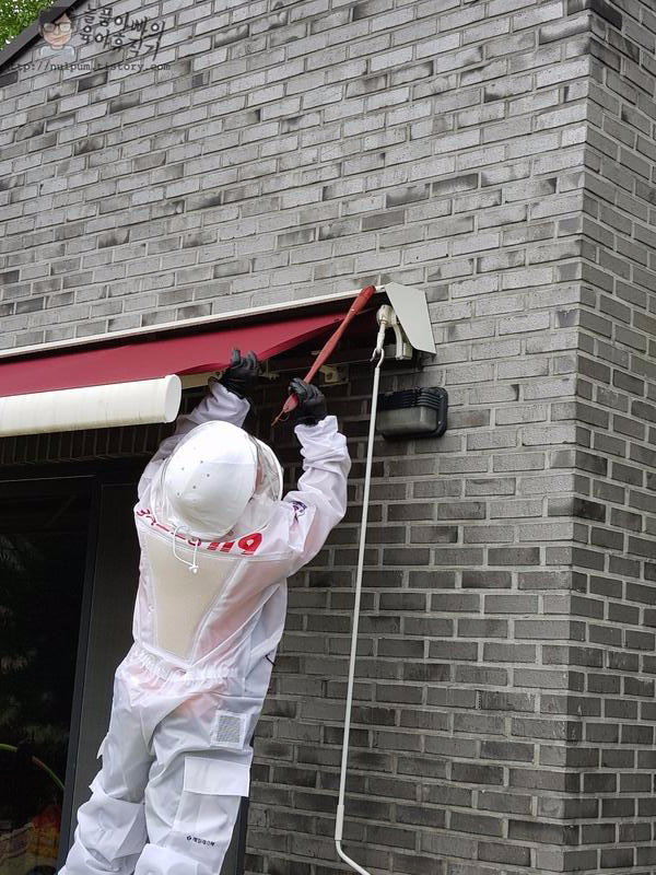 금방 소방대원께서 도착하시고 해충 방호복을 착용하십니다. 7~8월이었으면 더 더워서 방호복 입고 작업하시기 힘들겠네요.
