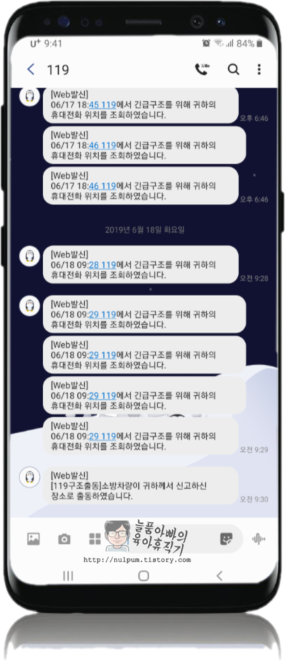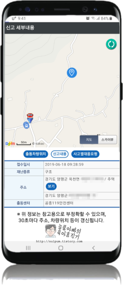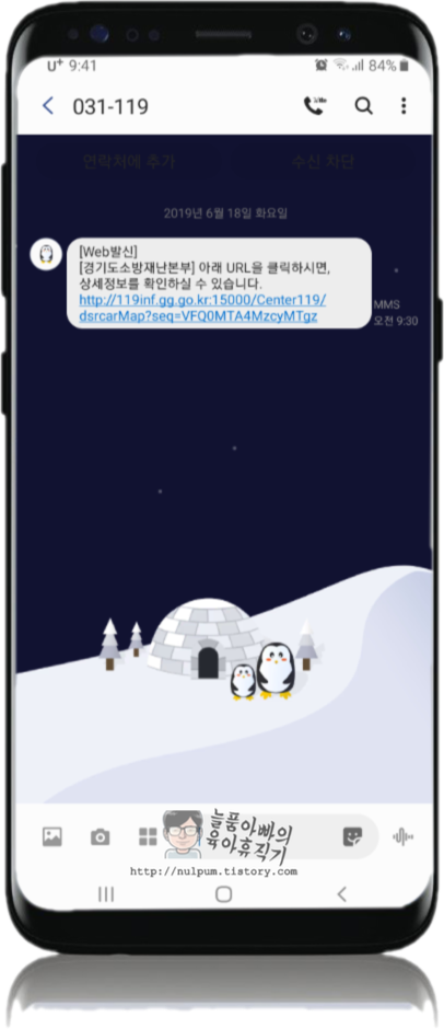 몇 분 안되어서 제 위치를 확인한다는 문자가 오고, 소방대원 출동상황을 알 수 있는 URL도 문자로 옵니다.