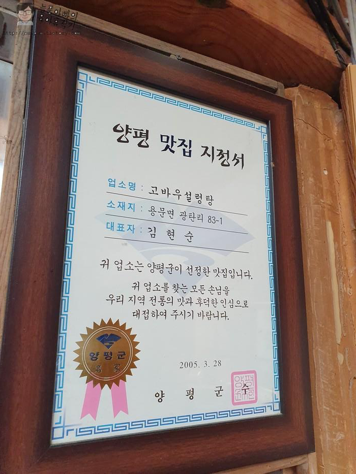 위의 '담배 피우는 소'? 로고를 확인하라고 하네요. 양평군에서 맛집으로 지정한 고바우 설렁탕은