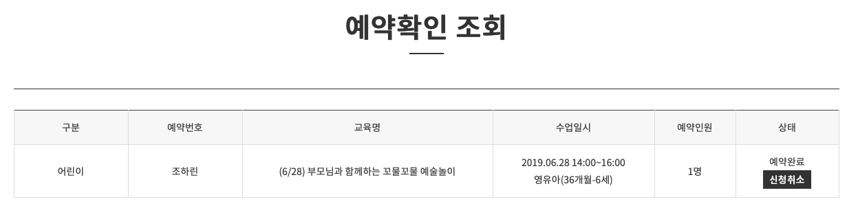'오감을 자극하는 영유아 대상 예술체험 프로그램'이라는 거창한? 문구를 보고 막내딸이 하면 좋을 거 같다는 생각이 들었습니다. 그렇지만 집으로 돌아와 홈페이지에 접속해서 신청을 했는데 대기 4순위였어요.