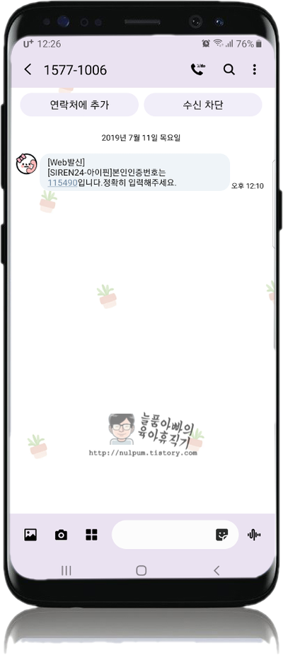 제가 입력한 번호로 본인인증을 시도했는지 SIREN24에서 본인 확인용 문자가 오더군요 ㅠㅠ
