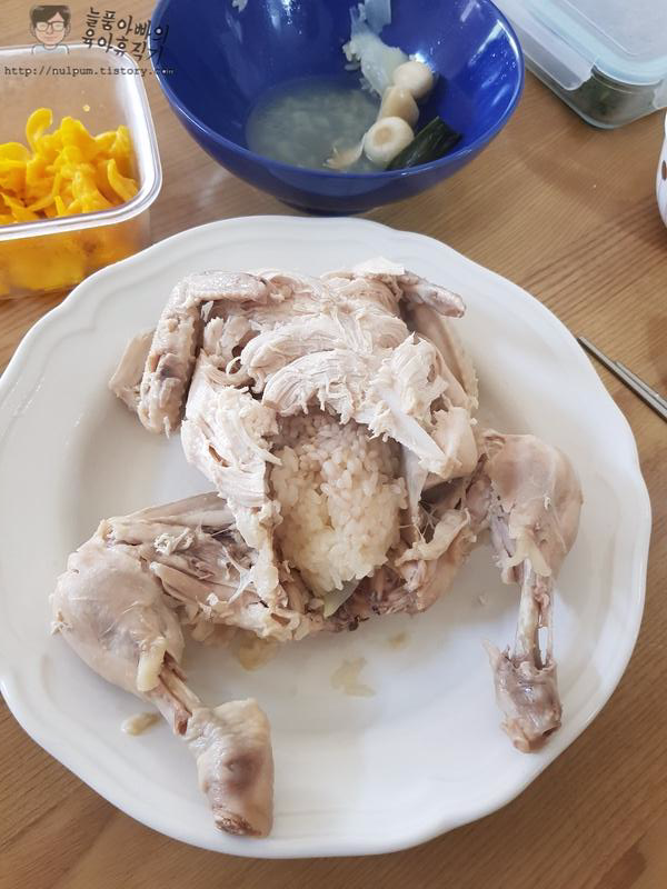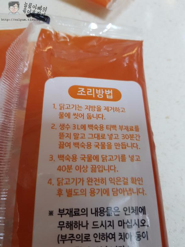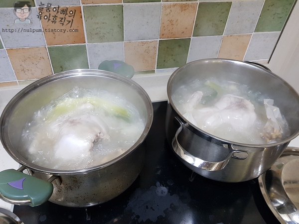 조리방법에는 국물 내는 데에 30분, 닭을 넣고 40분을 더 끓이라고 했는데, 저는 20분 30분? 정도 끓였습니다.