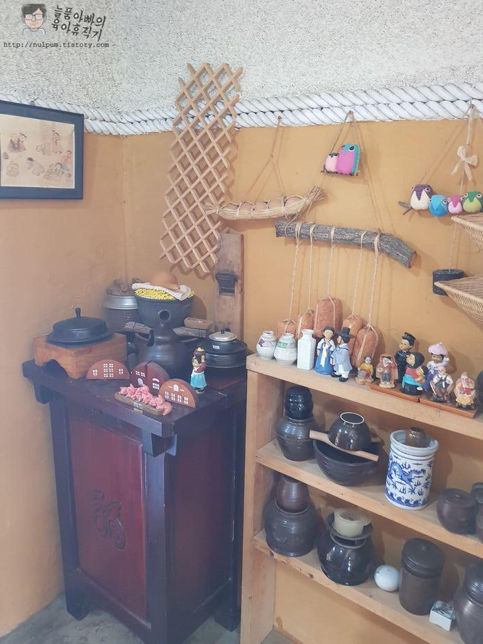 식당 입구와 실내 곳곳에 아기자기한 액세서리와 인형들이 전시되어 있었습니다.