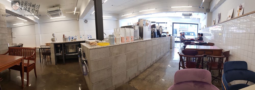 매장 중심에 커피머신과 키친? 이 있고 주위를 빙~ 둘러싸서 테이블이 있는 구조였습니다.