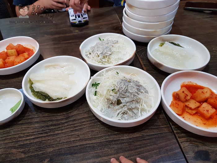 찬은 깍두기, 백김치, 흑임자 샐러드? 이렇게 나옵니다. 물론 추가 찬은 셀프로!