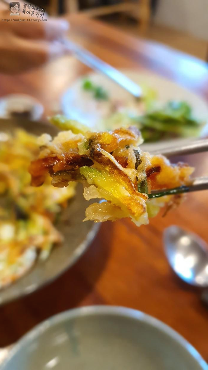 애피타이저로 도토리묵, 야채전(야채튀김에 가까운), 샐러드가 나왔습니다.