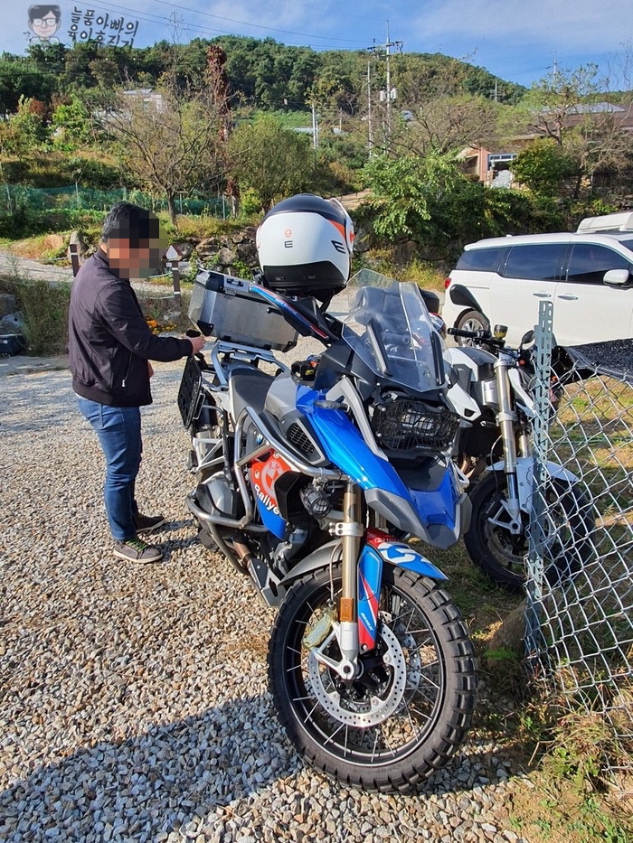 두 명 모두 BMW 오토바이에 액션캠도 달려있고, 잘은 모르지만 라이더들의 소품 이것저것 달려있는 게