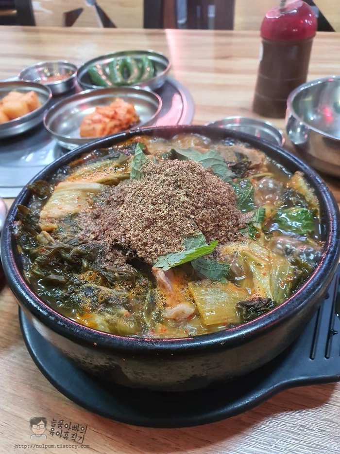 팔팔 끓는 뚝배기에 넘칠듯이 어마어마한 양과 함께 들깨가루가 듬뿍~