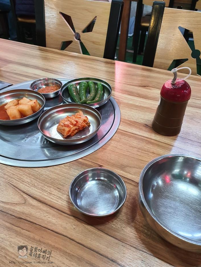 먼저 깍두기, 배추김치, 고추, 쌈장과 함께 소스 종지 그릇, 뼈 그릇을 줍니다.