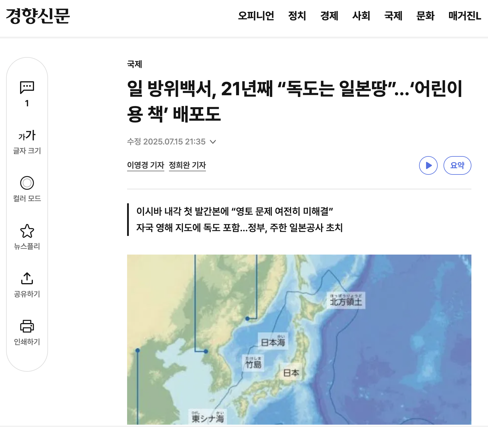 최근 ‘일 방위백서, 21년째 “독도는 일본땅”…‘어린이용 책’ 배포’라는 기사를 읽으며 우리나라와 일본 간의 영유권 분쟁이 얼마나 지속되고 있는지 다시 한번 실감하게 되었습니다. 특히 일본이 21년째나 ‘독도는 일본땅’이라고 공공연하게 주장하며, 심지어 어린이용 책까지 배포하는 모습을 보며 과연 얼마나 뻔뻔한 태도인지 새삼 느꼈습니다.