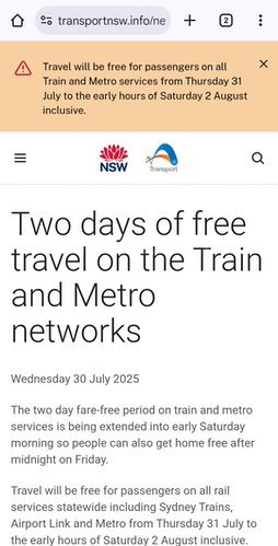 내일 아침 일찍 비행기라 오늘은 호텔 조식도 포기하고 일찍 나서야 했어요. 원래는 공항세 때문에 우버 택시를 이용할 생각이었는데, 갑자기 반가운 소식이 들려왔습니다! 내일부터 이틀 동안 시드니 기차와 지하철 요금이 무료라는 거예요! 이런 행운이! 덕분에 내일 아침에는 중앙역에서 기차를 타고 공항으로 편안하게 이동할 수 있게 되었어요. 마지막 날까지 저희 가족에게 이런 뜻밖의 선물을 주는 시드니, 정말 떠나기 아쉽네요.