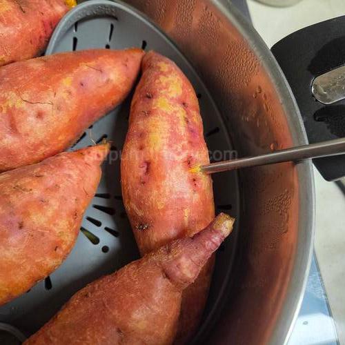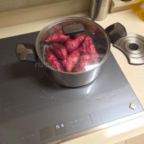 다 익힌 고구마는 즉시 꺼내지 말고, 불을 끄고 5~10분 정도 더 뜸을 들이면 수분이 잘 퍼져 한층 더 촉촉하게 완성됩니다.