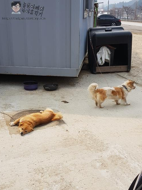 식당 앞 공터 주차장에 있는 댕댕이들입니다.