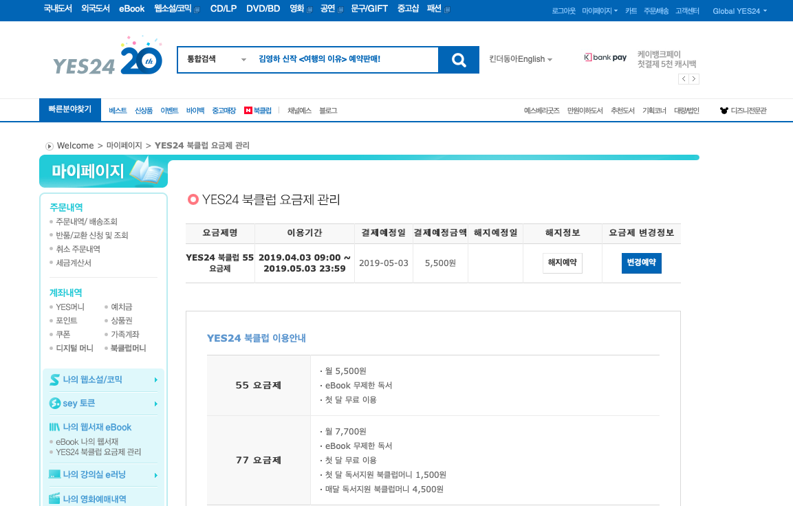 그동안 YES24의 북클럽 서비를 이용하며 한 달에 5,500원을 결재해왔습니다.